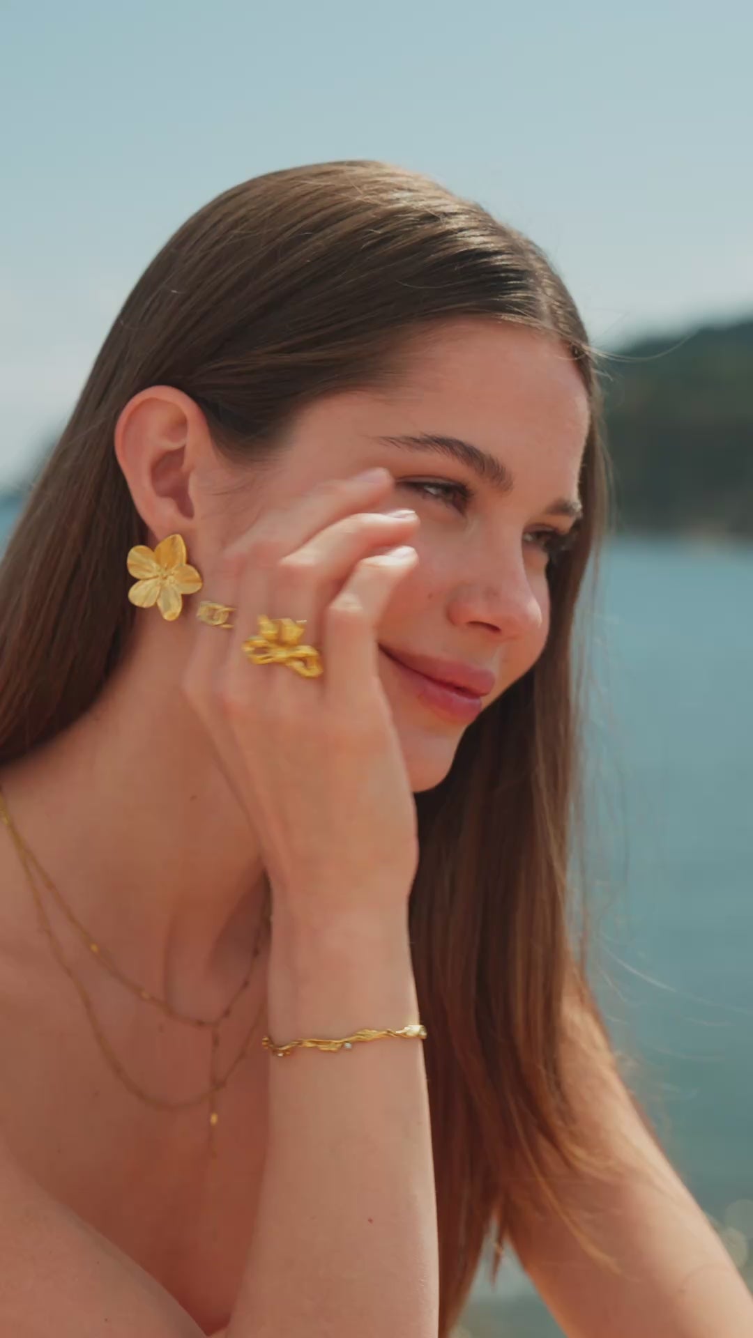 The Jara earrings are a powerful fusion of classic form and modern elegance. Their bold, layered design creates a flowing silhouette that catches the light and adds depth and glamour to any look. Crafted from stainless steel and plated with 18-karat gold, they are both striking and timeless – designed to highlight your inner strength and grace.